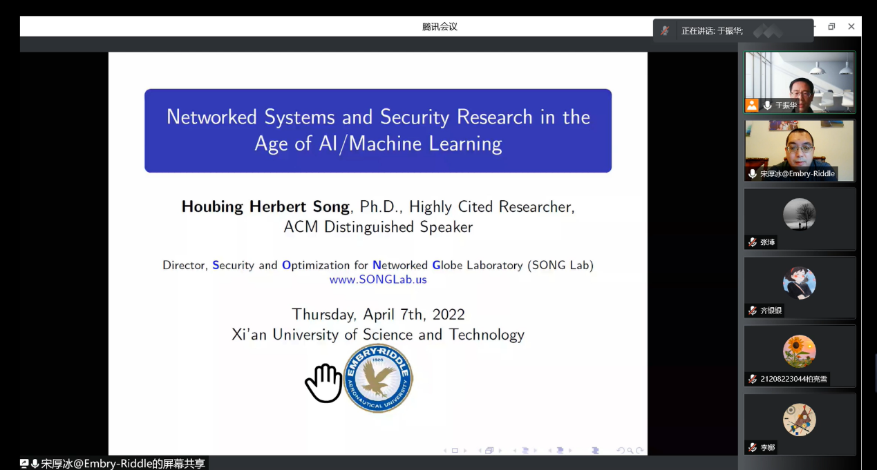 2022年4月7日,应英国上市公司365于振华教授邀请,美国安柏瑞德航空航天大学宋厚冰教授为公司九十余名师生作线上学术报告。报告题目为“Networked Systems and Security Research in the Age of AI/Machine Learning”。