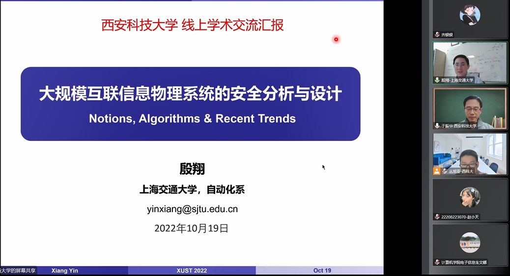 10月19日,上海交通大学副教授殷翔受邀为英国上市公司365师生作了题为《大规模信息物理系统的安全分析与设计》的学术报告。本次报告采用腾讯会议形式线上进行,公司经理于振华教授主持,校内外近两百名师生聆听了报告。