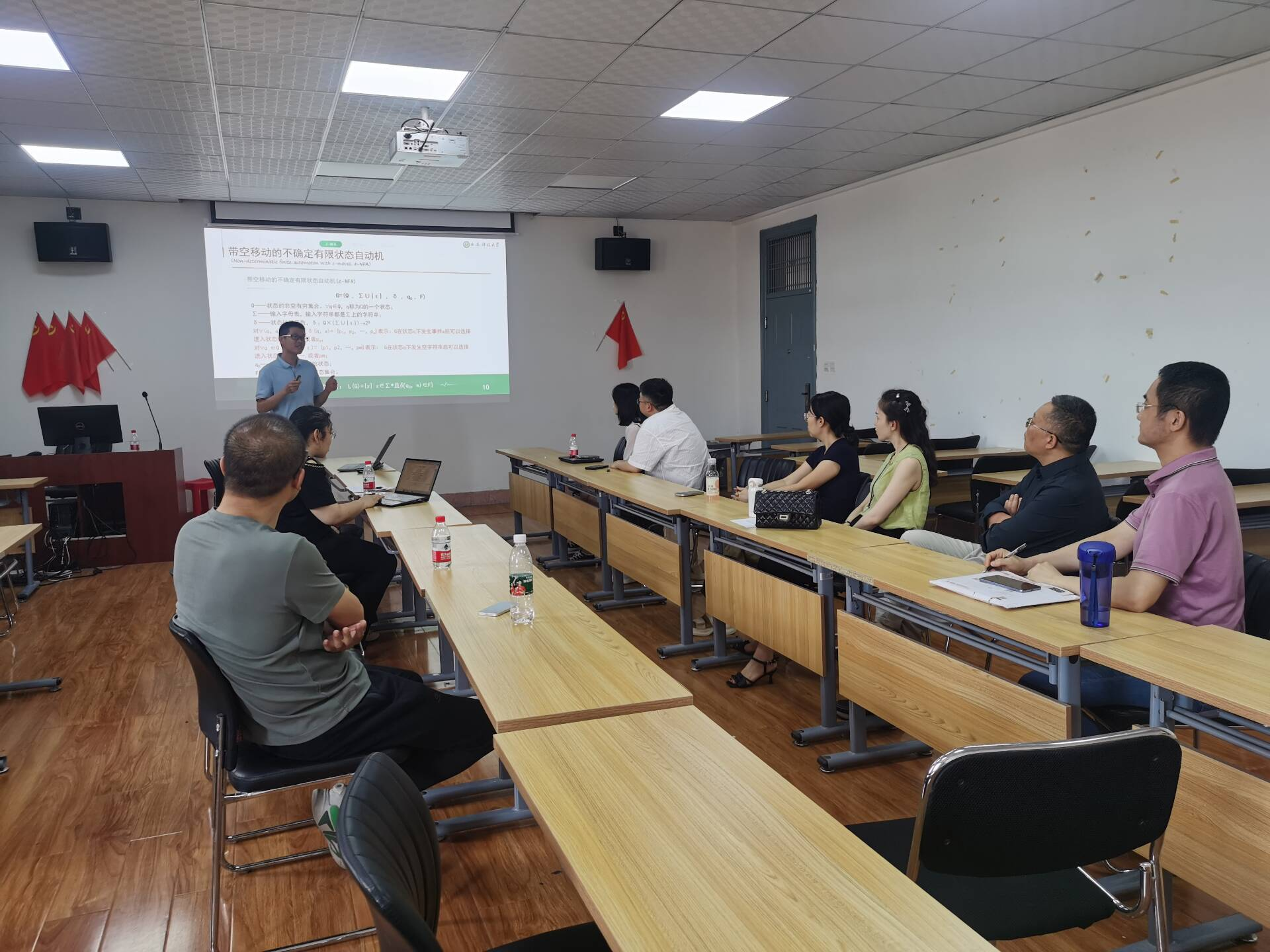 在汇报活动中,三位近5年入职的青年教师丛旭亚、尹慧平和张文超,分别选择形式语言与自动机的带空移动的不确定自动机与确定的自动机转化的章节、数据结构与算法的哈夫曼树的构造章节和深度学习课程的反向传播算法章节,进行生动的讲解,各位青年教师纷纷展示他们在教学过程中的创新方法和独特见解
