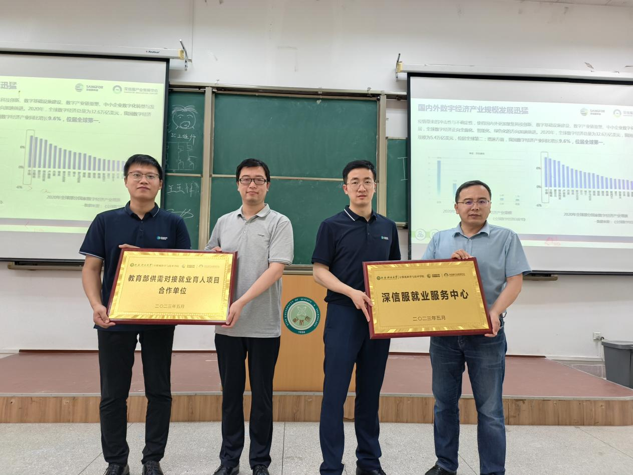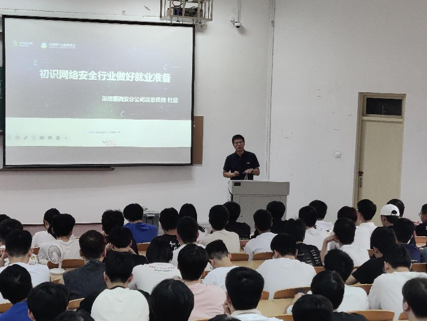 活动开始,杜斌以《初识网络安全行业做好就业准备》为题,详细介绍了深信服公司的文化、业务以及未来的发展方向,并以网络安全为重点,对标企业需求,详细讲解了同学们需要掌握的知识技能和面试技巧,为下一步的学习和实践提供了明确指导。随后,深信服公司与英国上市公司365进行了“深信服就业服务中心”和“教育部供需对接就业育人项目合作单位”授牌仪式。