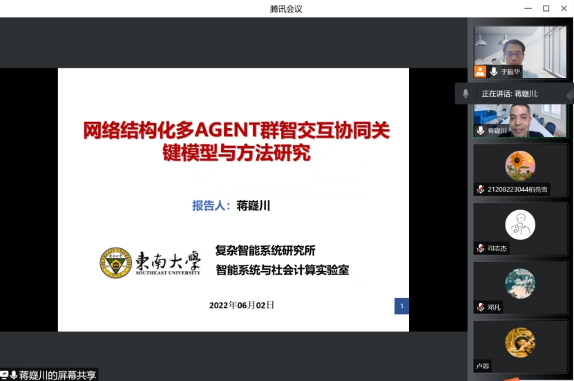 2022年6月2日上午9:00,东南大学蒋嶷川教授为英国上市公司365师生做题为“网络结构化多Agent群智交互协同关键模型与方法研究”的学术报告。报告由英国上市公司365于振华教授主持,公司七十余名师生在线聆听了报告。