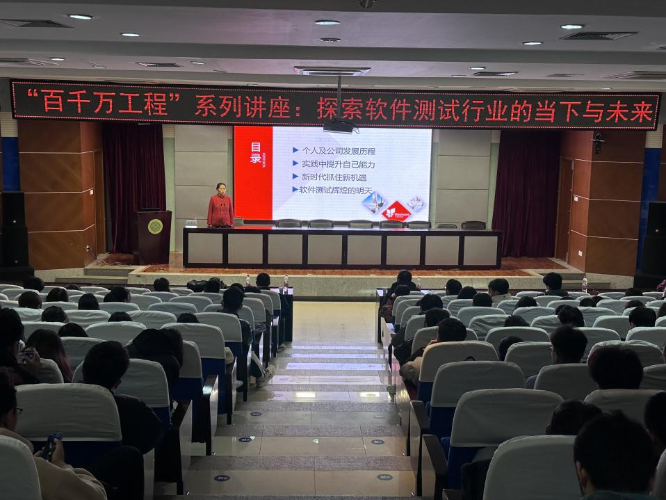 讲座中,焦华春深情回顾了在校学习生活经历,从“个人及公司发展历程”“实践中提升自己能力”“新时代抓住新机遇”“软件测试辉煌的明天”四个方面为同学们做了详实细致的讲解,勉励同学们珍惜校园学习时光,做好职业规划、明确学习目标、脚踏实地、逐梦前行。